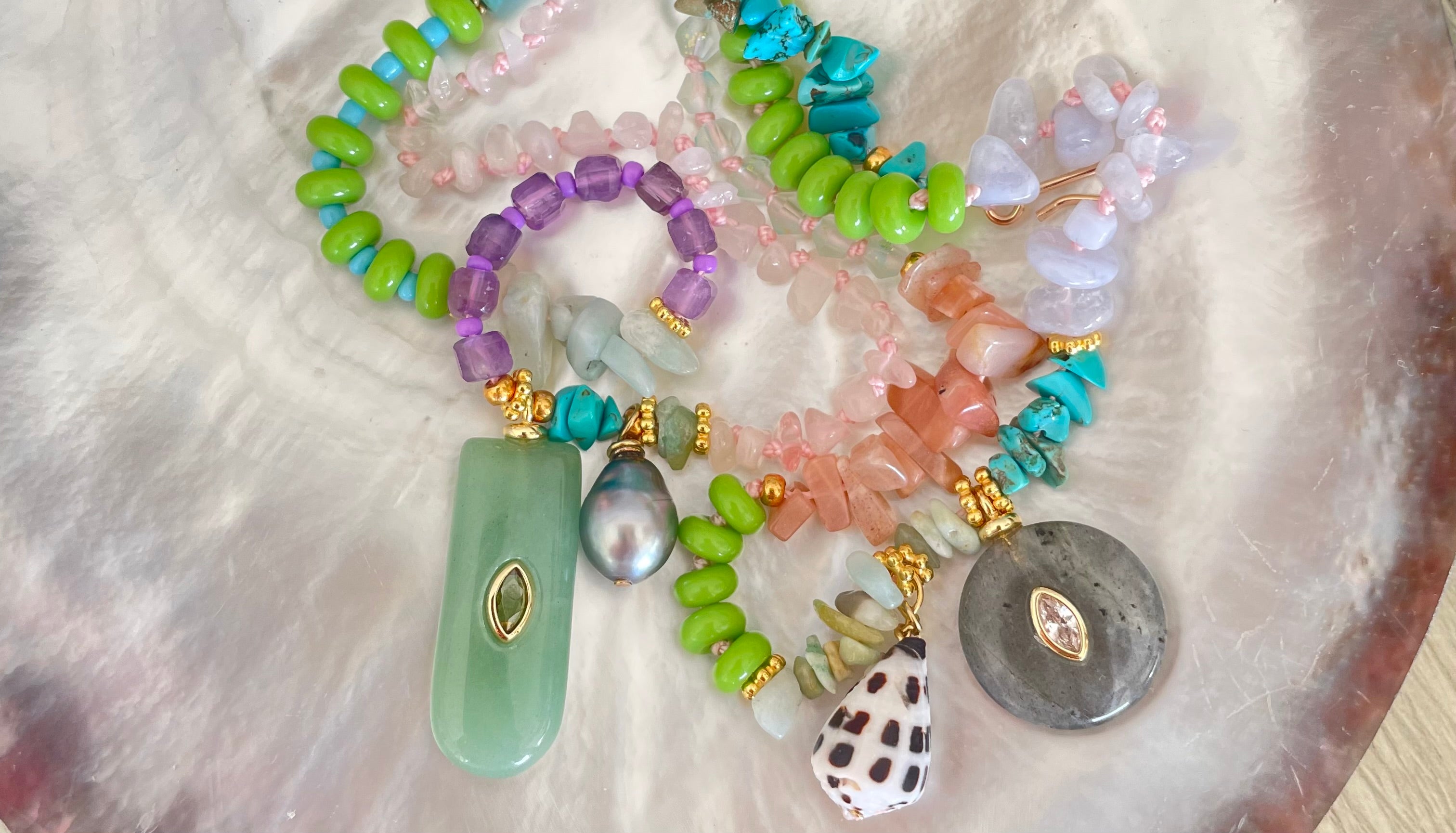Des perles, des coquillages et des pierres semi précieuses